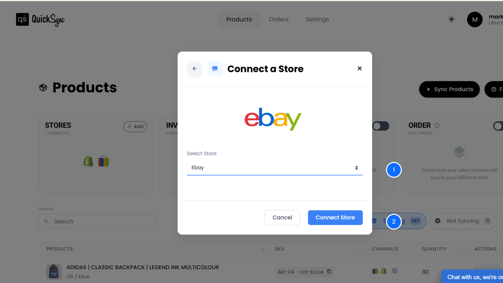 • Once you have connected stores, in the QuickSync dashboard, you will see syncing options.